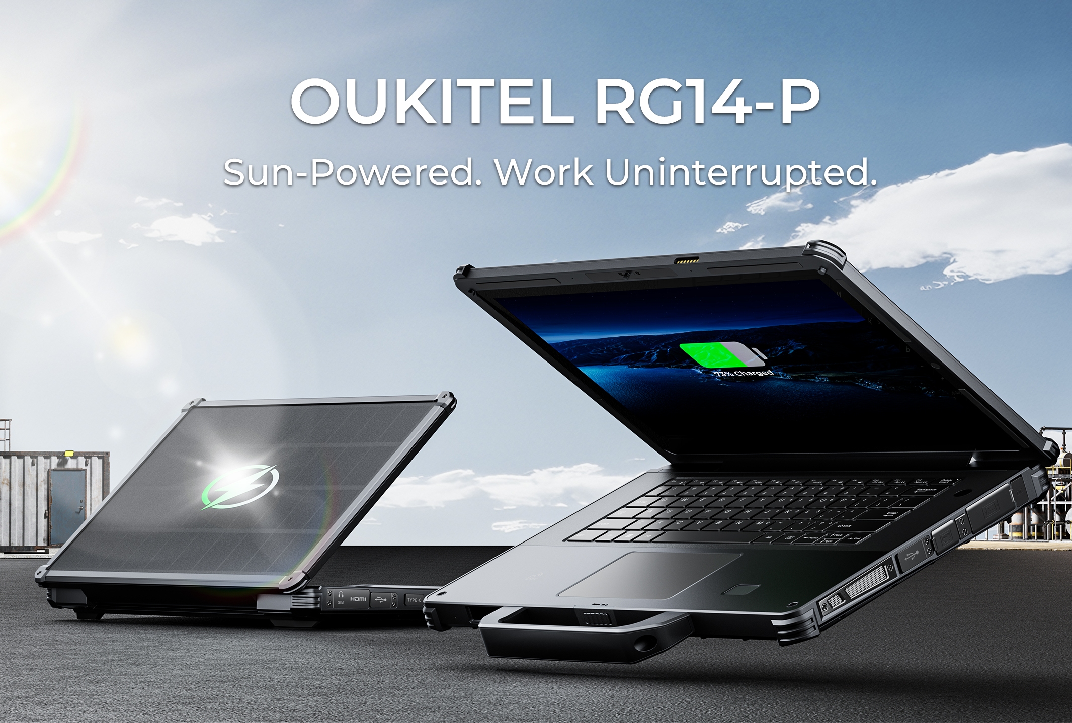 Китайська Oukitel анонсувала перший у світі захищений ноутбук з сонячною батареєю RG14-P з 14,1″ сенсорним екраном.