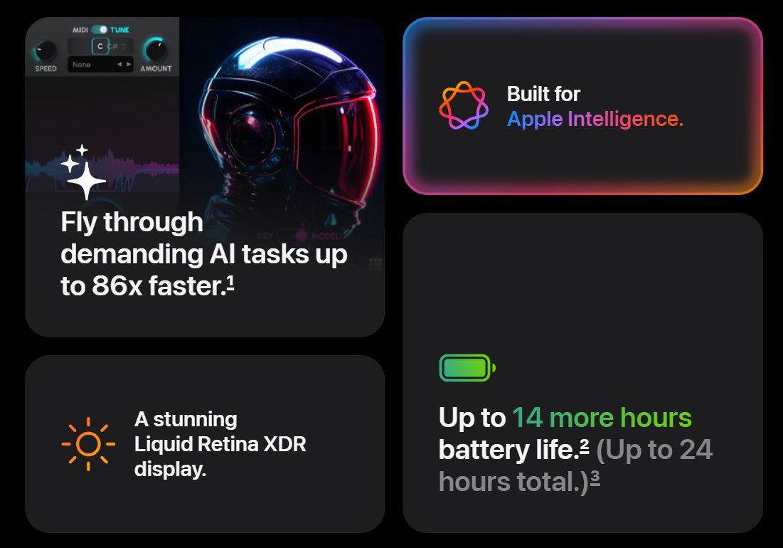 Apple називає новий MacBook Pro “наступним великим стрибком у сфері штучного інтелекту для Mac”. Ймовірно, через процесор, для якого задекларована у 3,5 раза більша швидкодія ШІ, ніж в M4. Він отримав 10 ядер GPU з нейронними прискорювачами, котрі забезпечують до 1,6 раза вищу частоту кадрів в іграх порівняно з попередником. Десятиядерний CPU забезпечить до 20% покращення багатопотокової продуктивності.
