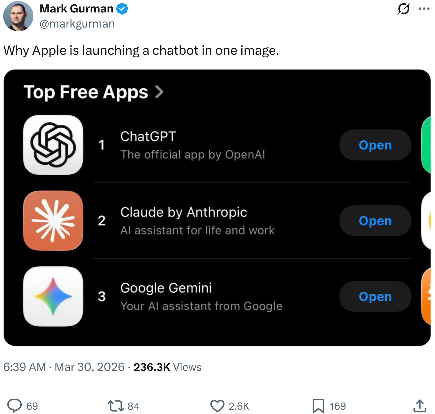 Застосунки-чатботи стабільно очолюють топ-чарти App Store і вже входять до числа найпопулярніших програм на iPhone. В iOS 27 Siri отримає схожий функціонал, але в рідному Apple-дизайні та попередньо встановленому вигляді. Для порівняння: в iOS 26 Apple також додала нові застосунки на головний екран — Preview та Games, — однак жоден із них не став масовим хітом.