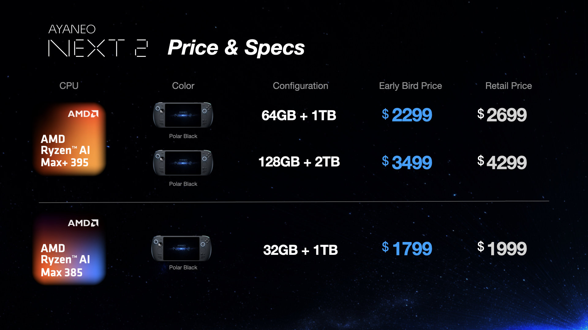 Ryzen AI Max 385 з 32 ГБ + 1 ТБ пропонується за ціною $1799 (для перших покупців) та $1999 за роздрібною ціною. Знижка для перших покупців складає від $200 до $800 залежно від конфігурації. Next 2 отримає 9,06″ OLED-панель з роздільною здатністю 2400×1504p та частотою оновлення до 165 Гц, а також яскравістю 1155 ніт. Пам’ять LPDDR5X-8533 з варіантами на 32 ГБ, 64 ГБ та 128 ГБ залежно від моделі. Підтримуються два накопичувачі PCle 4.0, один з яких М.2 2280 (X4), а другий М.2 2230 (X4) на 512 ГБ, 1 ТБ та 2 ТБ.