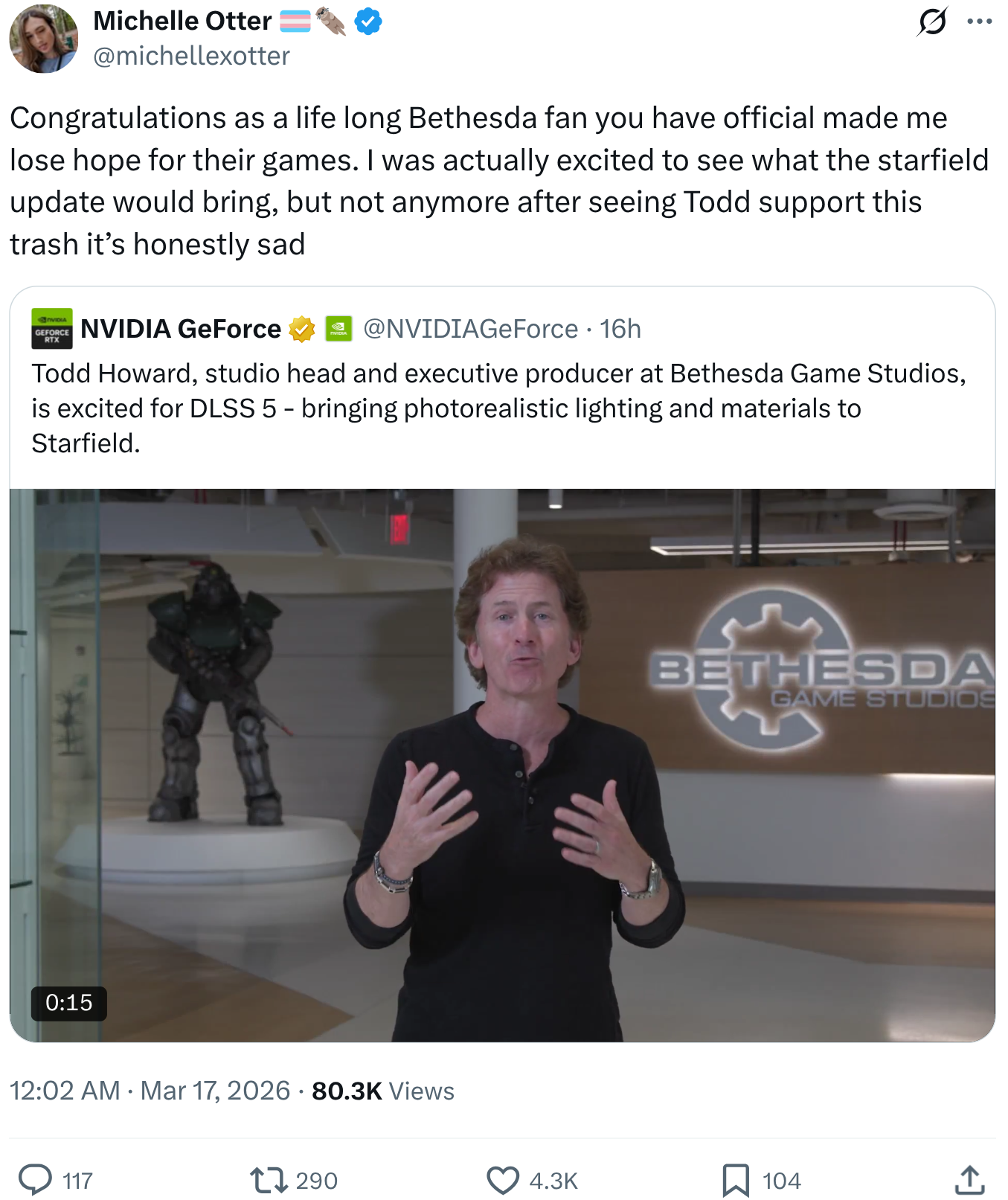 Останній коментар пов’язаний із зауваженнями користувачів про те, що DLSS 5 фактично накладає ШІ-згенеровану графіку поверх оригінальної, що деякі назвали “образою для власних художників” і закликали “не змушувати арт-команди працювати з цим”. Втім, Bethesda додала, що продовжує працювати з NVIDIA, щоб знайти баланс між покращенням зображення та збереженням оригінального художнього задуму.