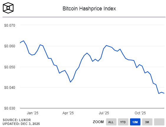 Очікуваний денний дохід на PH/s (hashprice) впав з приблизно $55 у третьому кварталі до близько $35 зараз. Це суттєво нижче орієнтовної медіанної all-in собівартості у $44 на PH/s на день, яку аналітики використовують для порівняння hashcost із hashprice. Падіння відбувається на тлі того, що хешрейт мережі залишається біля позначки 1,1 зетахеша. The Miner Mag першим повідомив про показник $44, базуючись на стандартизованому аналізі провідних публічних майнерів.