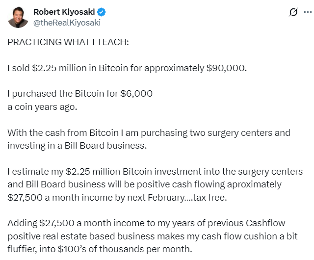 Тим часом Кійосакі повідомив, що продав біткоїни, придбані кілька років тому за ціною близько $6 тис. за монету, за середньою вартістю приблизно $90 тис. за біткоїн. Отримані $2,25 млн він спрямував у реальні активи — два хірургічні медичні центри та бізнес із рекламними білбордами, очікуючи, що до лютого 2026 року вкладення забезпечуватимуть близько $27 500 пасивного доходу щомісяця без оподаткування. Підприємець заявив, що планує відновити купівлю BTC після запуску грошового потоку й пояснив, що йому радили не розкривати деталі угод через ризики безпеки.
