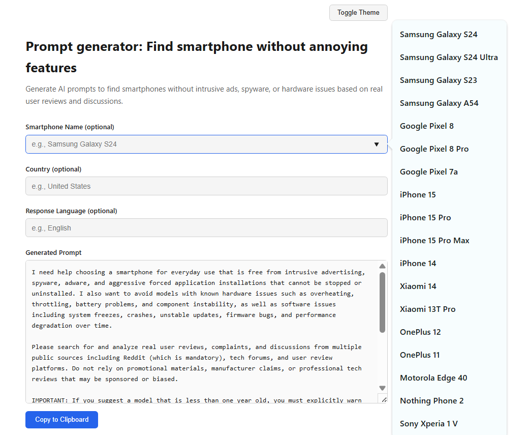 Як це працює? Без ШІ, власне, не обійшлось. Ви просто вводите назву свого потенційного нового смартфону на сайті, а він шукає проблеми, описані у відгуках на Reddit. Доступні три поля введення: для назви смартфона, країни та промту для пошуку, який генерується сайтом. Поки відгуки доступні для обмеженої кількості моделей, однак є серії Samsung S23-24, iPhone 14-15, Pixel 7A та 8, а також з десяток інших.