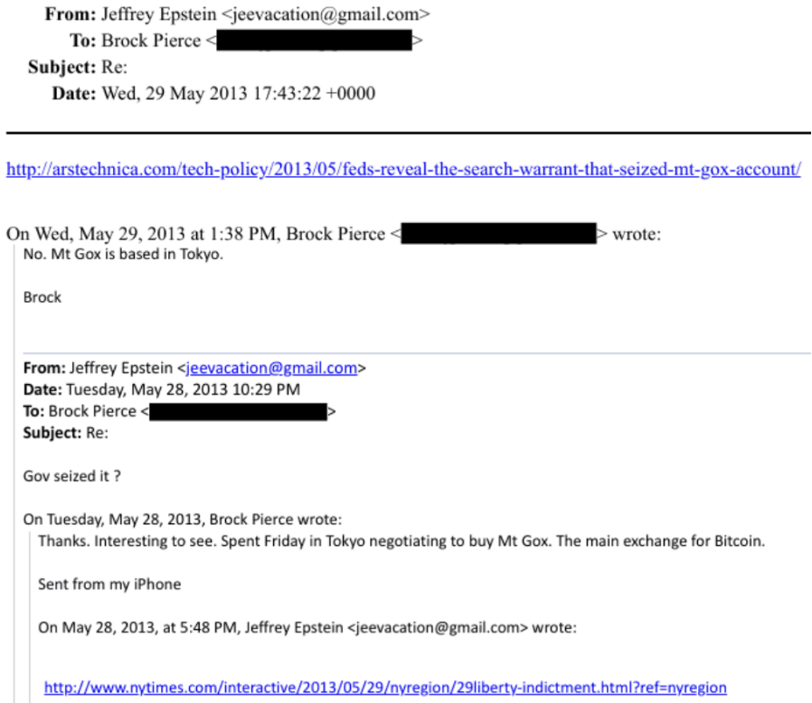 Пірс регулярно інформував Епштейна про події на крипторинку. У переписці згадуються зростання вартості біткоїна, спроби придбати біржу Mt. Gox та контакти з братами Вінклвоссами. Епштейн цікавився можливістю інвестувати в Coinbase і просив допомоги у встановленні контактів із ключовими учасниками криптоіндустрії. Обговорювалися потенційні партнерства та питання регулювання криптовалют, а також стратегічні інвестиції.