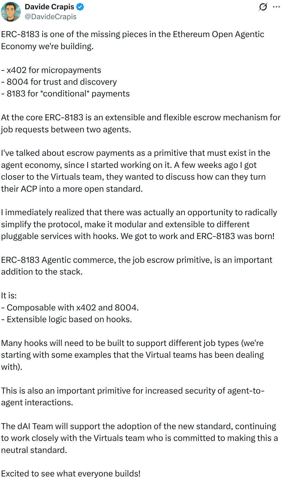 “ERC‑8183 — це один із відсутніх елементів у Ethereum Open Agentic Economy, який ми будуємо. x402 для мікроплатежів 8004 для довіри та виявлення 8183 для умовних платежів. У центрі ERC‑8183 — розширюваний і гнучкий механізм ескроу для запитів на роботу між двома агентами. Я відразу зрозумів, що є можливість радикально спростити протокол, зробити його модульним і розширюваним. Ми взялися до роботи, і ERC‑8183 народився! ERC‑8183 Agentic commerce, примітив ескроу для роботи, є важливим доповненням до стеку”, — пише Давиде у Х.
