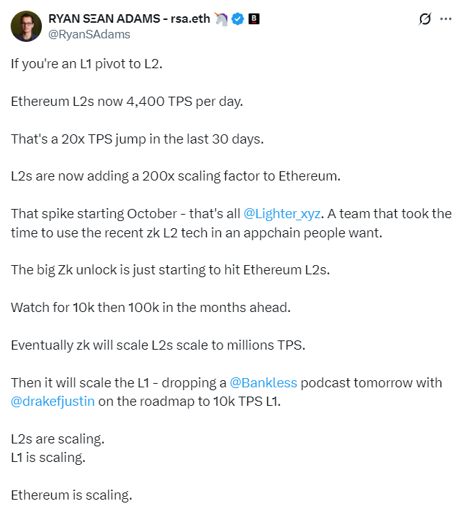 Ведучий подкасту Bankless Райан Шон Адамс назвав досягнення результатом “масштабування в 200 разів” завдяки рішенням другого рівня. За його словами, потенціал Ethereum може сягати 100 000 або навіть 1 000 000 транзакцій на секунду в найближчі місяці. Подібні тенденції вже видно на інших мережах Layer 2, зокрема Base та Optimism, де кількість транзакцій після останніх оновлень зросла з 8 до 14 млн.