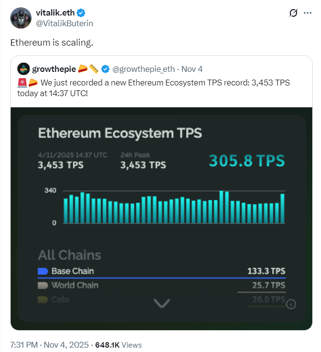 Паралельно, 4 листопада 2025 року, основна мережа Ethereum також оновила власний рекорд — 3 453 TPS на рівні Layer 1, що в десятки разів перевищує середній показник у 15–30 TPS. Віталік Бутерін відзначив роль технологій zkSync Atlas та PeerDAS у подоланні обмежень пропускної здатності. На його думку, zkSync Atlas є “недооціненим, але цінним” компонентом масштабувальної стратегії Ethereum.