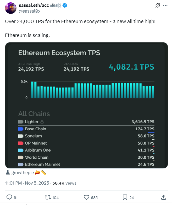 Екосистема Ethereum досягла нового максимуму продуктивності, зафіксувавши 24 192 транзакції за секунду (TPS) — найвищий показник за всю історію мережі. Рекорд став можливим завдяки інтеграції Layer 2-рішення Lighter, яке забезпечує близько 4 000 TPS самостійно.