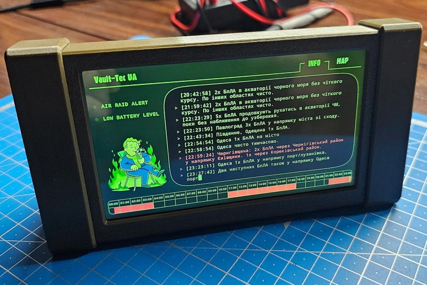 Українець поєднав любов до Fallout, невтішні реалії часів війни та власні технічні навички у корисному гаджеті. Він показує карту тривог та текстові повідомлення моніторингу.