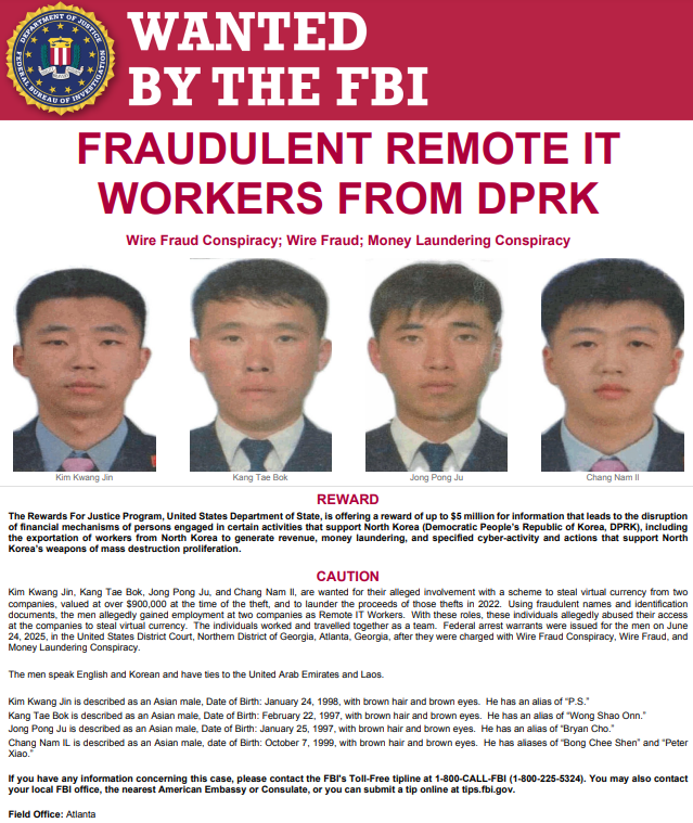 ФБР оприлюднило публічне повідомлення про розшук чотирьох громадян КНДР, яких звинувачують у шахрайській роботі як віддалених IT-працівників і викраденні криптовалюти на $900 тис. Ціна питання – $5 млн за будь-які відомості про підозрюваних.