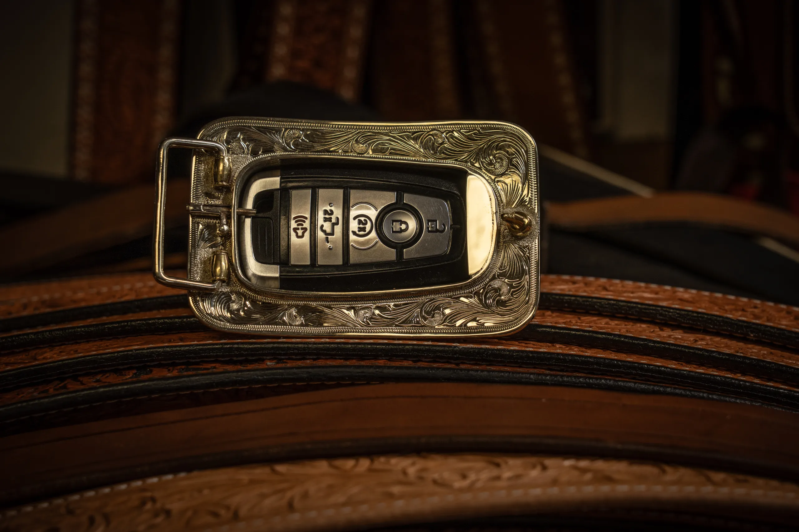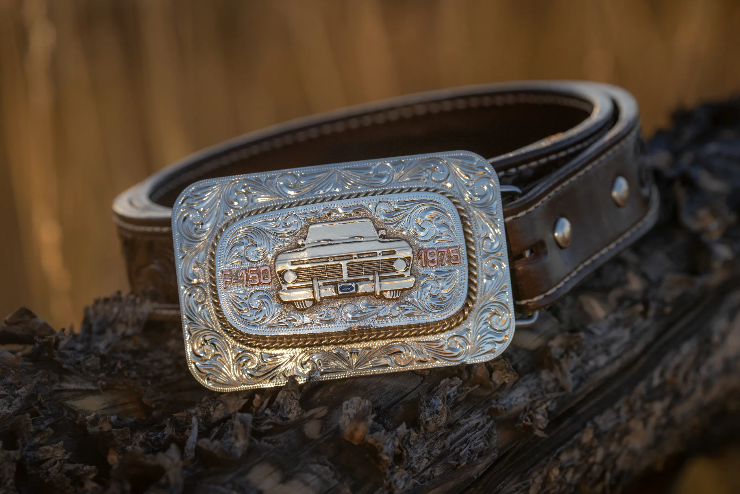 Аксесуар виготовляють вручну з нейзильберу та ювелірної бронзи, прикрашають гравіюванням передньої частини F-150 і синім логотипом Ford на стилізованому “номерному знаку”. Пряжка спроєктована так, щоб усередині можна було зручно зберігати брелок будь-якої моделі F-150, починаючи з 2018 року.