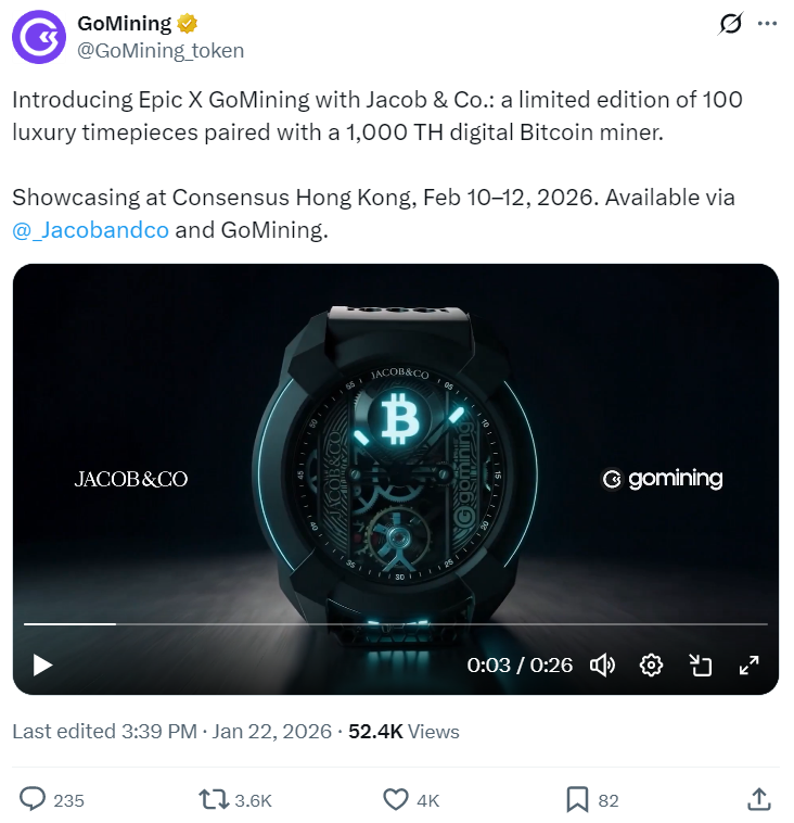 Ювелірний дім Jacob & Co у партнерстві з майнінговою платформою GoMining представив нову лімітовану колекцію Epic X GoMining — поєднання швейцарського механічного годинника преміум‑класу та цифрового майнера біткоїна із потужністю 1 000 TH/s.