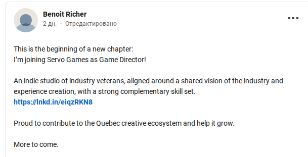 Про це він повідомив у LinkedIn. Разом з ветеранами індустрії — Люком Трамбле (президент і креативний директор), Алексом Друєном (директор анімації) та Дані Марку (арт-директор) — Ріше створив незалежну студію Servo Games у Квебеку. Там він очолив посаду геймдиректора.