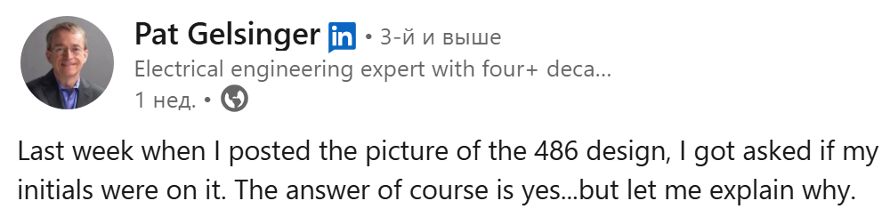 Ветеран-розробник, а також колишній голова Intel Пет Гелсінгер пояснив в LinkedIn, як сталося, що ініціали його та інших дизайнерів чипів вперше опинилися на кристалах. Здається, інженери просто так захотіли, але це викликало питання в керівництва.