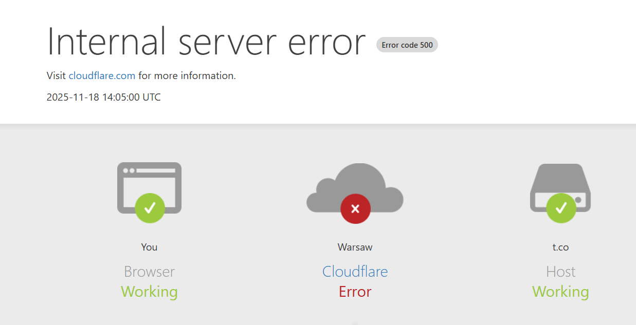 Масштабний збій в Cloudflare зупинив або частково ускладнив роботу сотень сайтів — зокрема ChatGPT, X, Spotify та порталів новинних видань, на кшталт Videocardz чи The Register. Цікаво, що з ладу тимчасово вийшов навіть Downdetector, який зазвичай використовується для відстеження збоїв в інтернеті.
