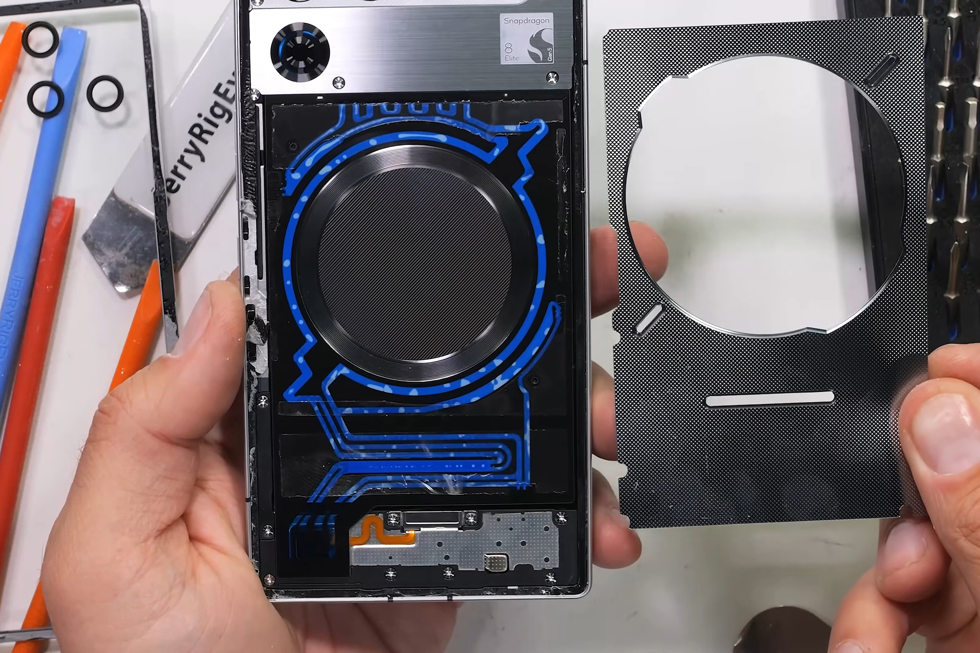 Синя рідина циркулює у тонких прозорих контурах охолодження. Присутні білі вкраплення, але Зак не впевнений, повітря це, чи ще якась біла рідина, а розбирати цей маленький тепловідвідник вщент він не став. П’єзоелектричний керамічний мікронасос, порівняний з вібромотором телефонів, помпує рідину. Система повністю відділяється від решти компонентів (за виключенням живлення помпи, звісно) і продовжує працювати. До речі, так, смартфон був розібраний та зібраний наново в увімкненому стані.
