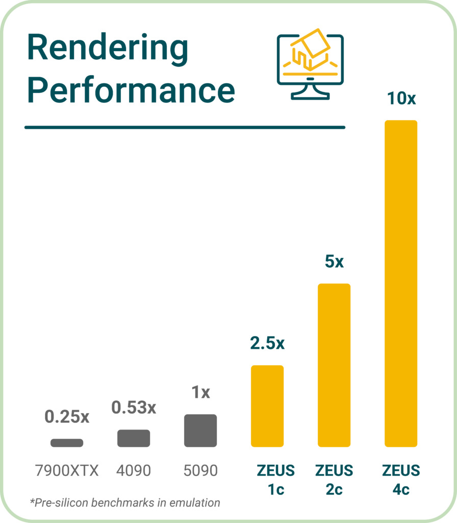Архітектура Zeus відрізняється від традиційних GPU AMD та NVIDIA. Замість звичайних конвеєрів на основі шейдерів, інтегровані ядра RISC-V спільно з користувацькими прискорювачами, розробленими спеціально для трасування. Використана Bolt метрика гігапромені не є загальноприйнятим мережевим стандартом, а порівняльні дані надані самою компанією за відсутності незалежного тестування.