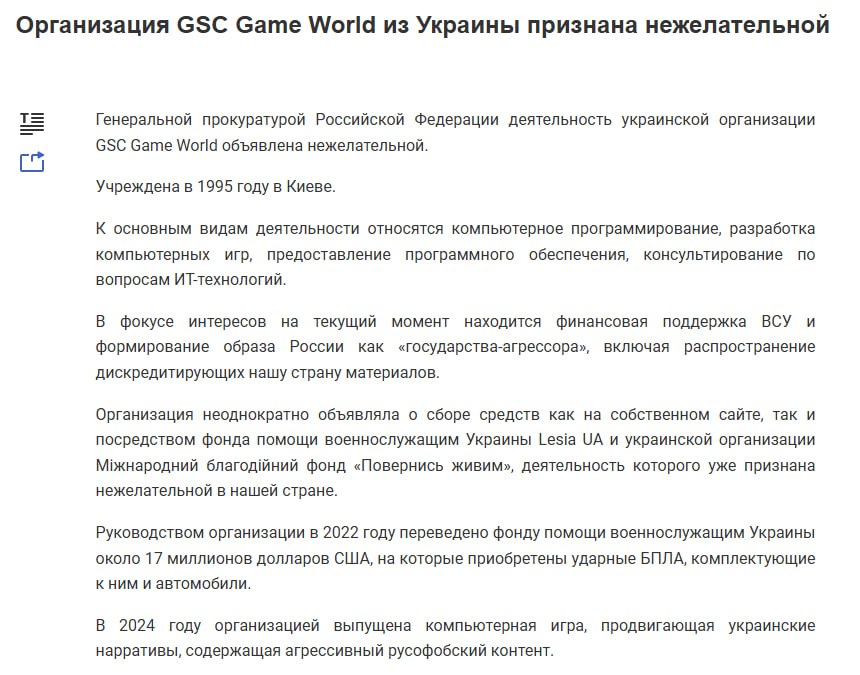 “У 2024 році організацією випущено комп’ютерну гру [S.T.A.L.K.E.R 2], що просуває українські наративи, що містить агресивний русофобський контент”, — додає генпрокуратура рф.