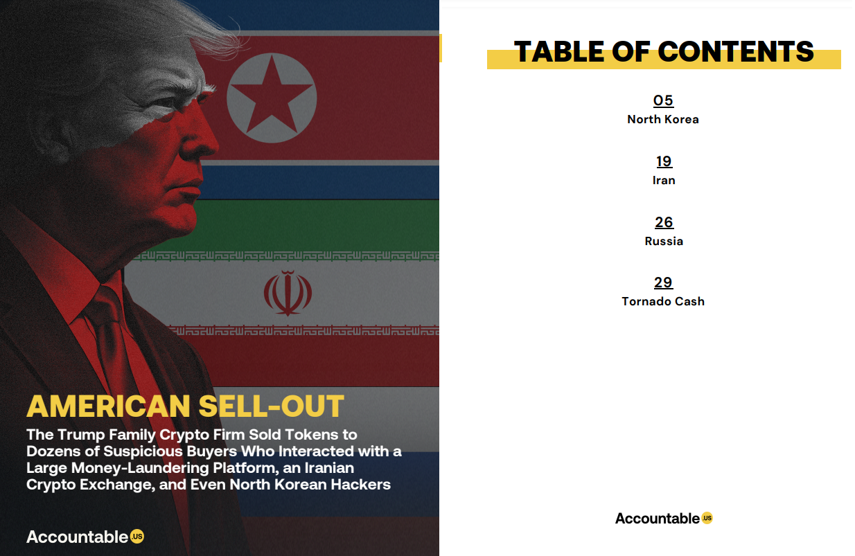Сенатори посилалися на вересневий звіт наглядової організації Accountable.US, у якому говорилося, що World Liberty Financial ще у січні продала токенів на суму $10 тис.трейдеру 0x9009, пов’язаному зі скандально відомою північно-корейською хакерською групою Lazarus, підсанкційним російським токеном А7А5, іранською криптобіржею NoBitex.ir та Tornado Cash — відомим майданчиком для відмивання грошей. World Liberty Financial заперечує будь-які правопорушення.