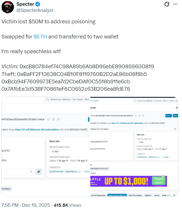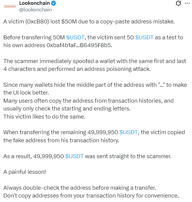 Платформа ончейн-аналітики Lookonchain повідомила, що жертва переказала 49,999,950 USDT на адресу, контрольовану шахраєм, 20 грудня. Згідно зі стандартною практикою, жертва спочатку надіслала невелику тестову транзакцію в 50 USDT на адресу призначення. При цьому автоматизований скрипт, контрольований атакуючим, одразу згенерував «підроблену» адресу гаманця, створену так, щоб початок і кінець алфавітно-цифрового рядка збігалися з реальною адресою жертви.