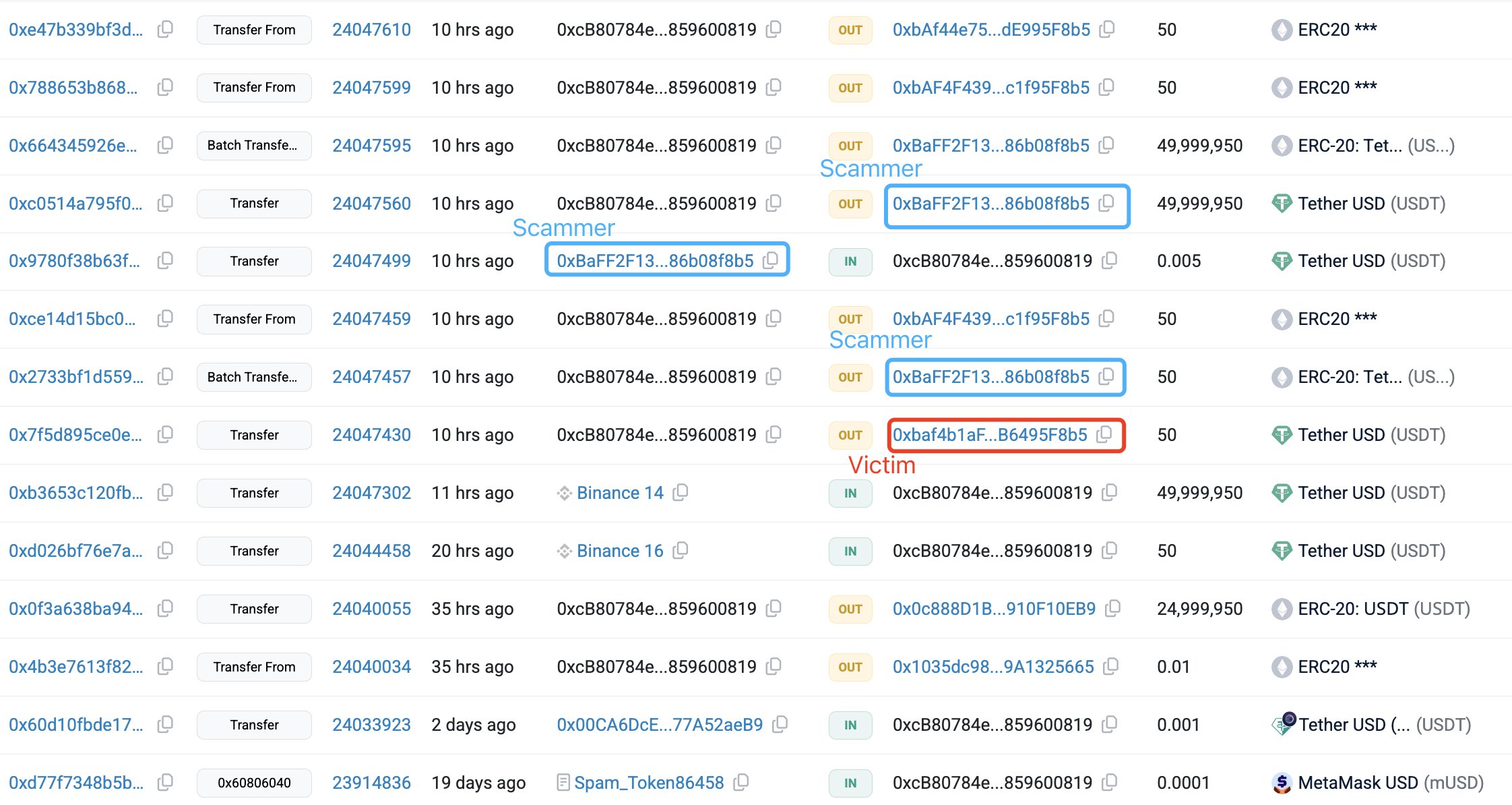 Криптовалютний трейдер зазнав збитків майже на $50 млн у стейблкоїнах USDT після того, як став жертвою так званого “отруєння адреси” — на перший погляд простої схеми, яка все ж іноді ловить необачних трейдерів. Атака сталася після того, як постраждалий вивів кошти з Binance і намагався перевести їх у власний гаманець.