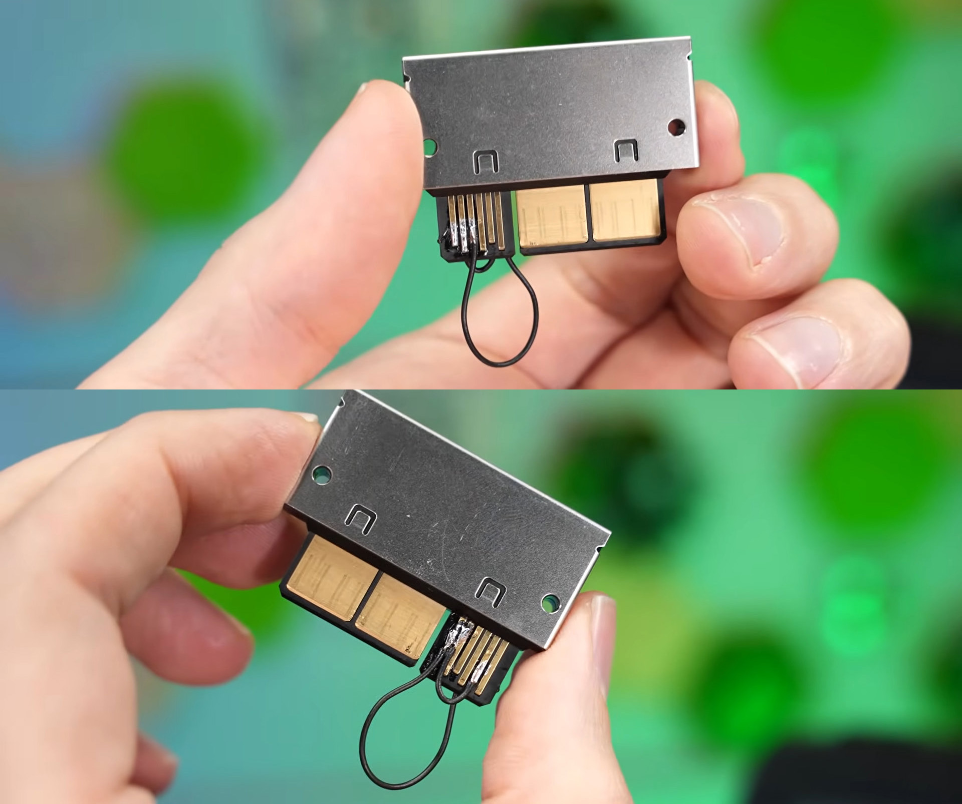 Першим кроком було замкнути контакти адаптера, щоб імітувати підключення материнської плати. Для цього der8auer з’єднав короткий контакт “присутності” та “землю”. Так відеокарта отримала фальшивий сигнал про приєднання материнки, але цього все ще недостатньо для збільшення живлення.