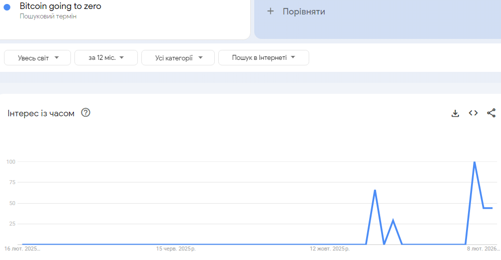 Тим часом, споживацька тривога навколо майбутнього Bitcoin досягла чергового піку: на Google Trends кількість пошукових запитів “Bitcoin going to zero” — тобто “Біткоїн обнулиться” — виросла до максимуму з листопада 2022 року після краху біржі FTX, показавши найвищий інтерес за останні кілька років. Цей показник досяг значення 100, що означає пік популярності пошукового запиту. Аналітики відзначають, що подібні сплески інтересу до фрази “Bitcoin to zero” у минулому часто збігалися з фазами максимального песимізму на ринку та локальних мінімумів цін. Наприклад, під час глибокої кризи 2022 року, коли BTC опускався до $15 тис., подібний рівень пошукової активності фіксувався тоді ж, після чого ціна пізніше відновлювалася.
