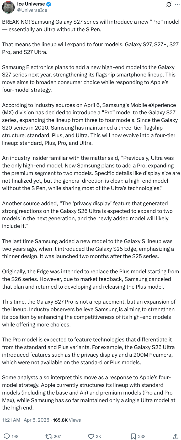 За даними галузевих джерел, про які першим повідомив витік від Ice Universe у X, підрозділ Samsung Mobile eXperience вирішив додати нову модель “Pro” до серії Galaxy S27, розширивши флагманську лінійку до чотирьох моделей: Galaxy S27, S27+, S27 Pro та S27 Ultra.