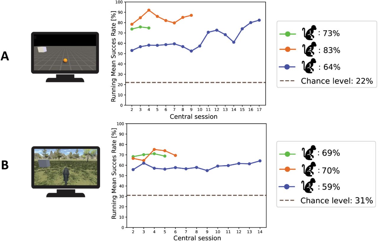 Вчені з Бельгії навчили мавп орієнтуватися в реалістичних тривимірних віртуальних середовищах за допомогою інтерфейсу мозок-комп’ютер — і зробили це вперше без будь-яких фізичних рухів під час тренування.