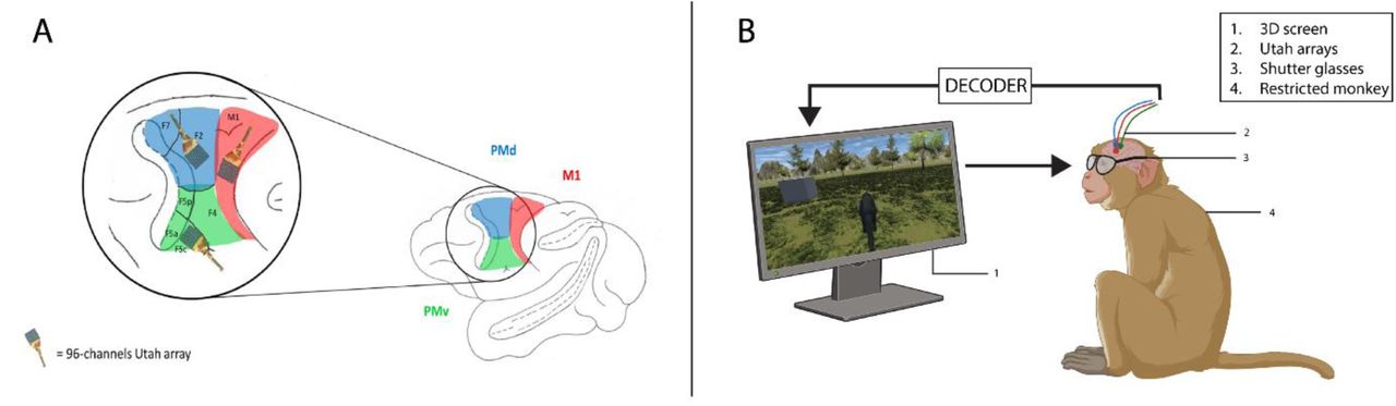 Перша ділянка широко використовується в BCI-дослідженнях і пов’язана з фізичним рухом, тоді як дві останні, вважається, задіяні у плануванні руху на вищому, більш абстрактному рівні. Електричні сигнали з імплантів інтерпретувала ШІ-модель, яка керувала VR-аватарами, поки мавпи спостерігали за 3D-монітором.