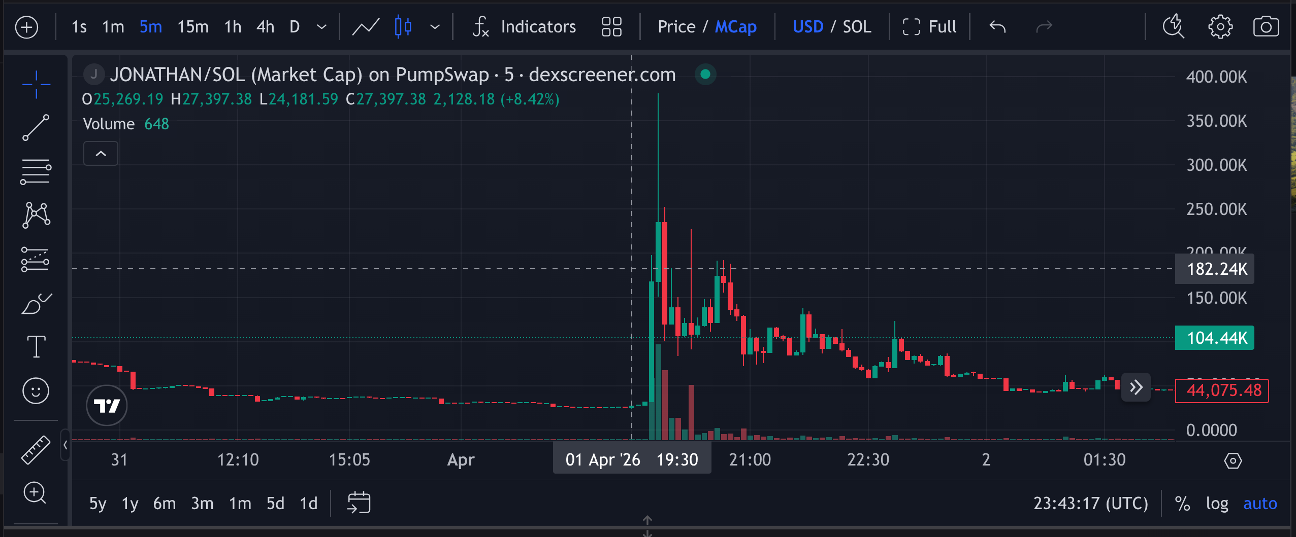 Поки історія набирала обертів, ринок відреагував миттєво. Мемкоїн JONATHAN, який з’явився ще влітку 2025 року, різко пішов угору: за даними DEX Screener, у піку ціна сягнула $0,00038. Після цього почалася корекція — типовий сценарій для подібних сплесків. Чітких зв’язків між творцями токена і авторами фейку немає, але сама ситуація виглядає показово: достатньо вірусного тригера, щоб малоліквідний актив отримав хвилю спекулятивного попиту.