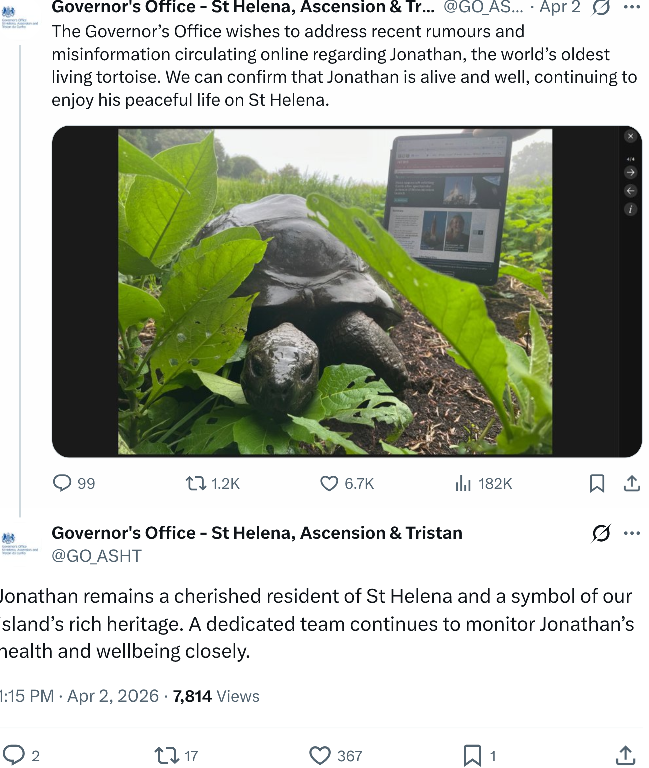 Інформація з’явилася 1 квітня в X: акаунт, що маскувався під ветеринара Джо Холлінса, заявив, що Джонатан помер. У дописі описували багаторічний догляд за твариною — від годування з рук до спостережень за її звичками. Пост швидко розлетівся платформою і вийшов за її межі — новину підхопили навіть великі медіа.