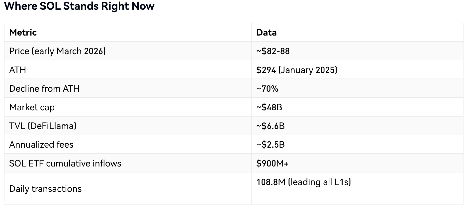 Мережа й досі субсидується на $228 млн на місяць, тоді як збори за останні 30 днів склали лише $39,25 млн. За оцінками Helius, понад половина всіх валідаторів були б збитковими без субсидій. Standard Chartered знизив цільову ціну SOL на кінець 2026 року з $310 до $250, пославшись на затримку переходу мережі до наступного домінуючого сценарію використання.
