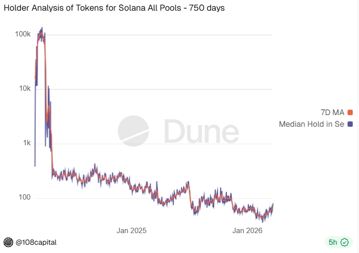 За даними Dune Analytics, динаміка падіння вражає: у 2024 році медіанний час утримання токенів у пулах Solana перевищував добу, у 2025-му — становив близько 100 секунд, а на початку 2026-го впав до приблизно 60 секунд. В окремі дні показник опускався до рекордних 44 секунд.
