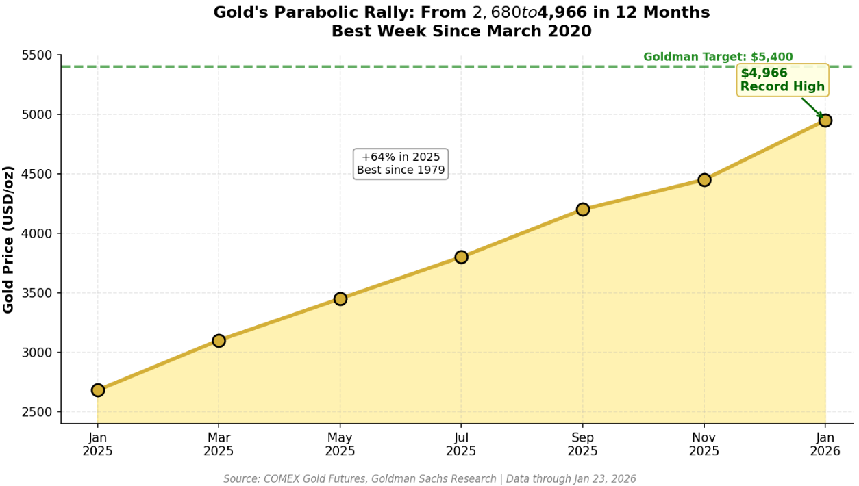 Спотова ціна золота перевищила $5 тис. за тройську унцію вперше в історії, досягаючи приблизно $5 080–$5 110/oz. У той же час ф’ючерси на золото для лютневих контрактів також торгувалися вище $5 079/oz. Ралі золота у 2025 році пов’язане з 64 % зростанням — один із найбільших щорічних приростів за десятиліття.