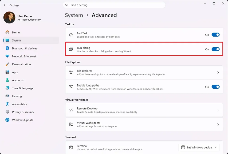 Важливо відзначити, що Microsoft зробить цей новий інтерфейс необов’язковим — його потрібно буде вмикати вручну через Налаштування > Система > Додатково, за допомогою перемикача “Діалогове вікно “Виконати””.