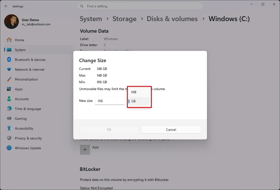 Microsoft також внесла невелику зміну у налаштування Сховища. Починаючи зі збірника 26300.8289, у розділі Налаштування > Сховище > Диски та томи, на сторінці властивостей конкретного тому, опція “Змінити розмір” включає налаштування для перемикання одиниці з МБ (мегабайт) на ГБ (гігабайти), що спрощує зміну розміру тому.
