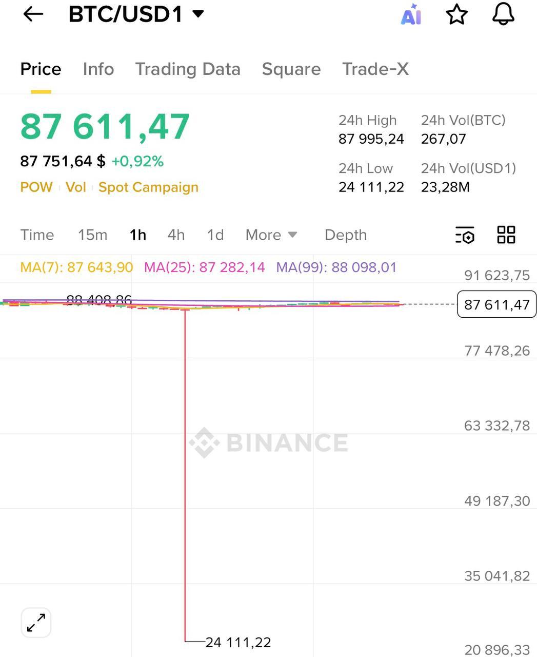 Біткоїн на Binance минулого раптово впав до $24 111 у парі BTC/USD1, після чого швидко відновився вище $87 тис. Різкий рух торкнувся лише пари зі стейблкоїном USD1 і не вплинув на інші основні пари BTC.