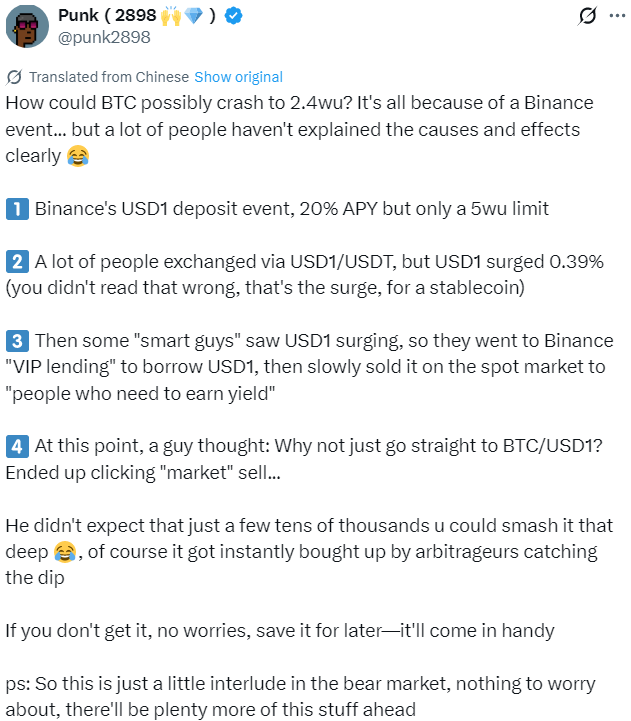 За словами користувача під псевдонімом punk2898, саме механіка дій трейдерів призвела до різкого падіння. Один із учасників ринку вирішив скористатися моментом і продав USD1 напряму через BTC/USD1, обравши “market sell”. Через неглибоку книгу ордерів і обмежену ліквідність це спричинило стрімке падіння біткоїна до $24 111. Ціна миттєво відновилася завдяки арбітражникам, які швидко викупили дешеві монети.