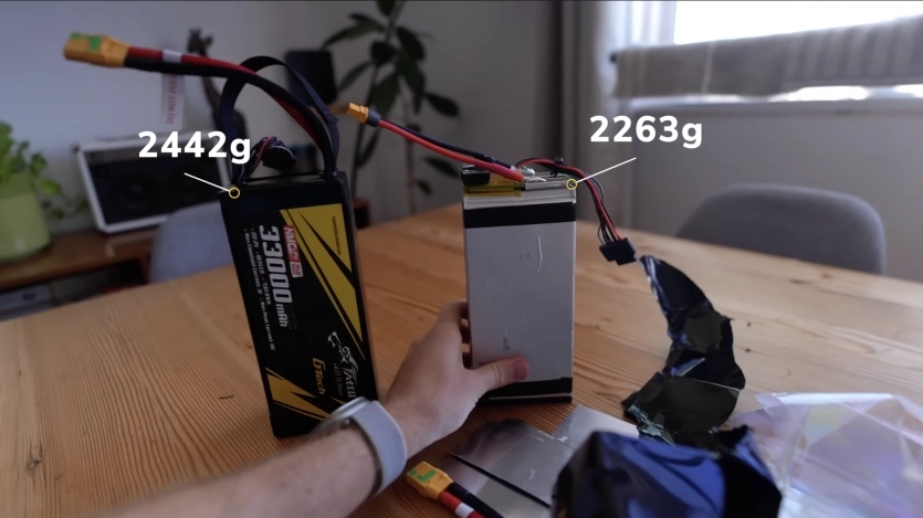 Ключовим компонентом стала батарея. Белл використав напівтверді NMC-елементи Tattu з енергетичною щільністю близько 320 Вт·год/кг — удвічі більше, ніж у звичайних LiPo-акумуляторів (близько 160 Вт·год/кг). Напівтвердий акумулятор — проміжний варіант між традиційними рідинними LiPo та повністю твердотільними елементами: електроліт має гелеву консистенцію, що підвищує щільність енергії, але без хімічної нестабільності, притаманної твердим конструкціям. Недолік — менша пікова здатність віддавати струм, але це не має значення, коли мотори обертаються повільно і споживають мало енергії. Белл навіть зняв частину захисної упаковки з батарей, полегшивши їх на 180 г (6,3 унції) кожну — загалом 360 г (12,7 унції), приблизно стільки ж, скільки важить увесь карбоновий каркас.