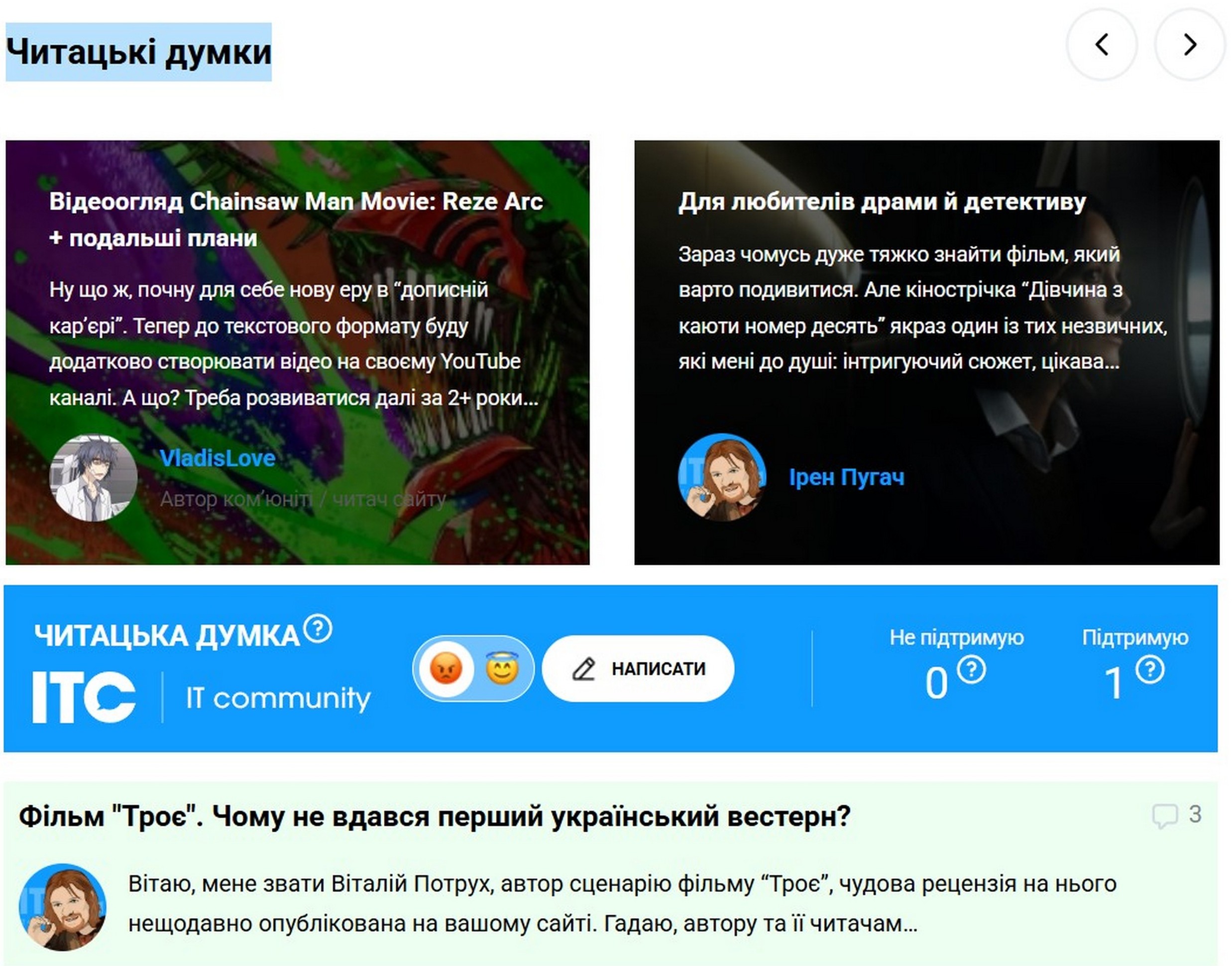 Нерідко траплялися випадки, коли “Читацькі думки” набирали більше переглядів, ніж новини, під якими їх залишили. Такий формат дозволив нашим читачам донести своє бачення та аргументацію до численної аудиторії ITC.ua.