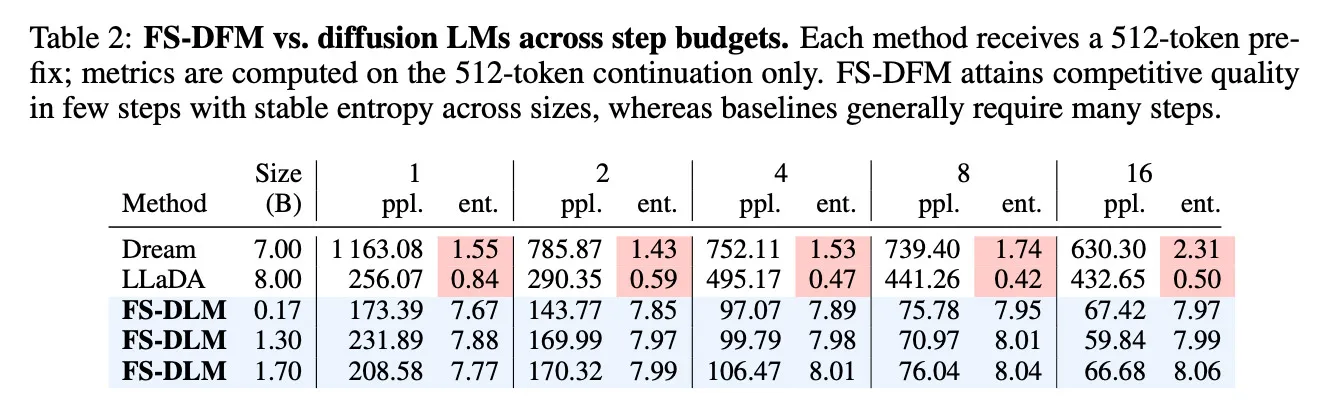 У тестах навіть компактні версії FS-DFM (із 0,17–1,7 мільярда параметрів) показали нижчий рівень складності тексту та стабільнішу ентропію — тобто впевненість у виборі слів. Для порівняння от результати інших моделей: Dream (7 млрд) і LLaDA (8 млрд). Якщо казати простіше, то тексти FS-DFM виглядають природнішими, а система не “плаває” між варіантами.