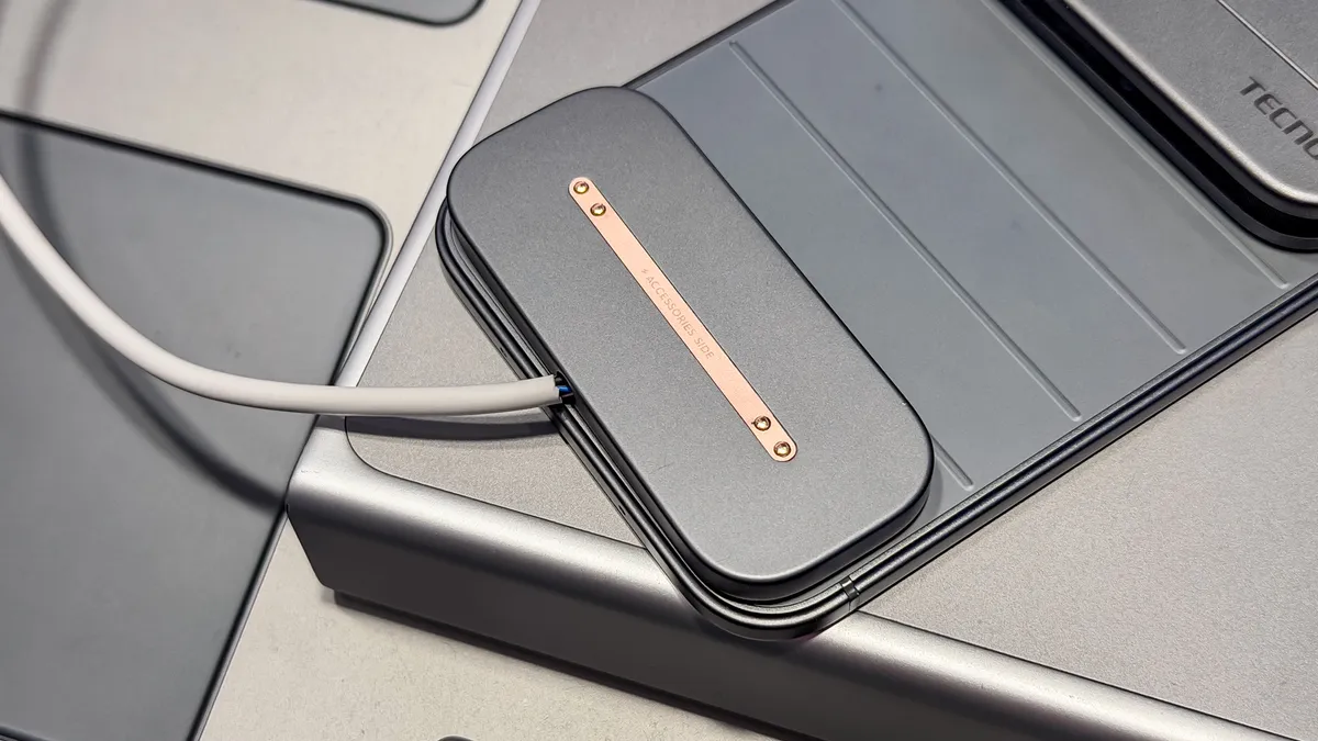 Усе починається з базового телефона. За своїм тонким профілем він трохи нагадує iPhone Air (хоча ще тонший — лише 4,9 мм / 0,19 дюйма завтовшки) та має велику камеру-панель у верхній частині задньої кришки. До магнітних точок, схожих на майданчики бронзового кольору, кріпляться модульні елементи. Tecno справді має їх багато.