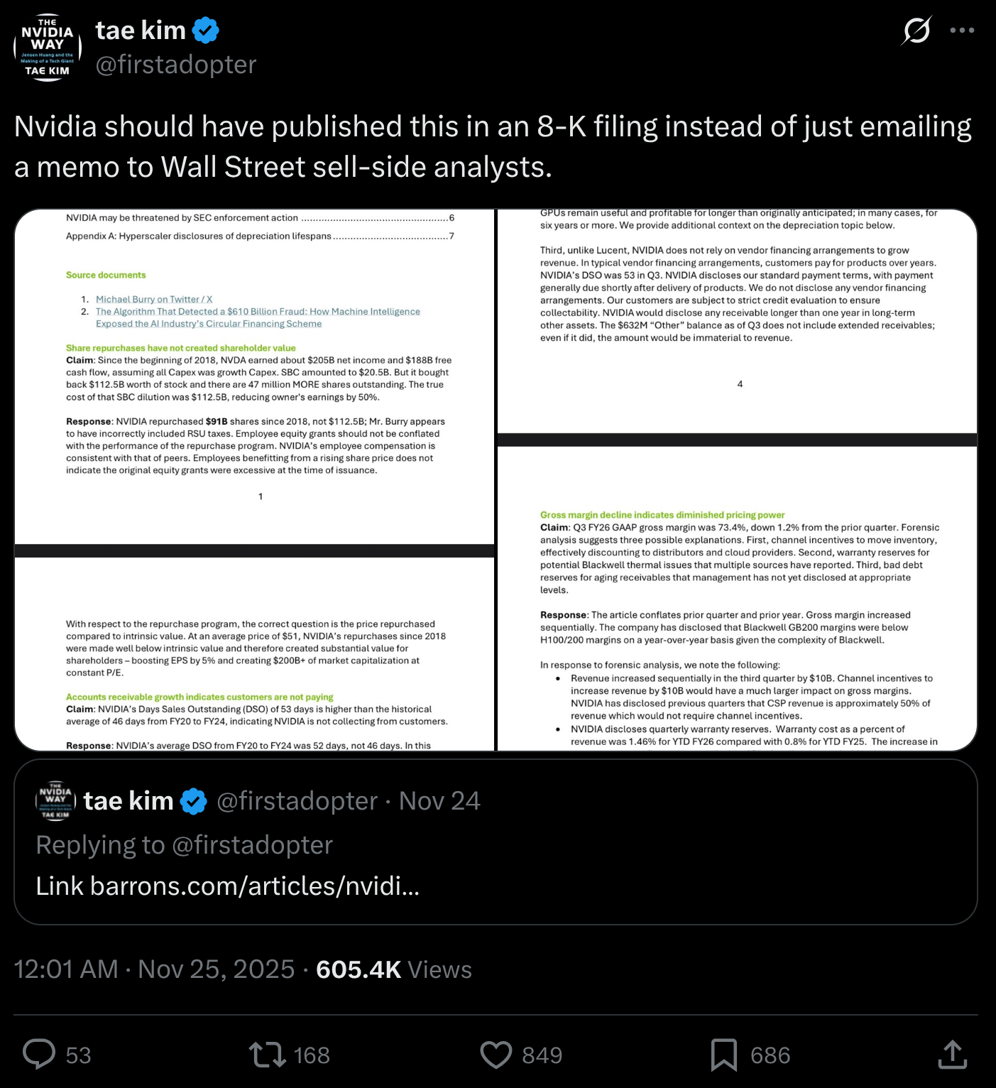 Хоча макростратег Джордж Піркс детально розгромив вірусний пост Перери та звинуватив його в генерації за допомогою ШІ, NVIDIA все ж вважала за потрібне відповісти як на його тезу, так і на коментарі Баррі. У записці, автентичність якої підтвердили Barron’s та The Verge, компанія назвала розрахунки Баррі некоректними та спростувала твердження, що вона приховує борги за допомогою спеціальних цільових структур — ключового елементу шахрайської схеми Enron.