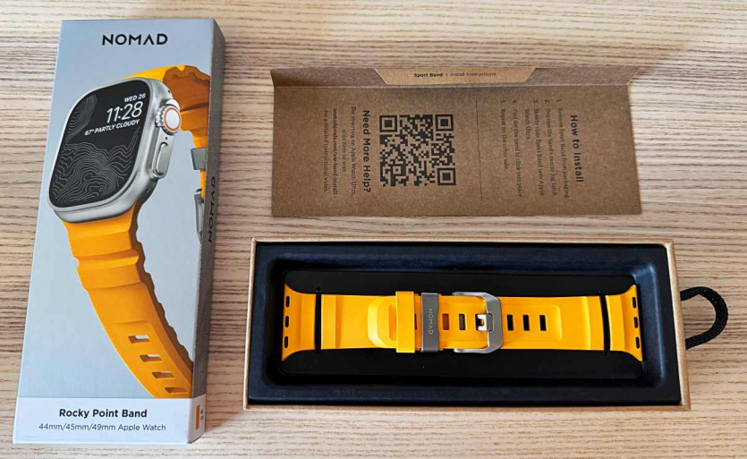 Nomad Rocky Point Band — це ремінець для Apple Watch, виготовлений методом компресійного формування. Він зроблений із надзвичайно міцного фтореластомеру на основі вуглецю (FKM), який добре сідає на руку, а доповнює конструкцію фурнітура з титану.
