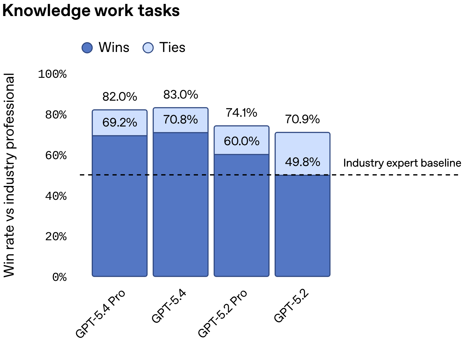 За словами OpenAI, GPT-5.4 — перша модель загального призначення, випущена компанією з вбудованими можливостями використання комп’ютера, що означає її здатність автономно працювати в різних застосунках на пристрої від імені користувача. Модель може писати код, виконувати завдання на комп’ютері, а також надсилати команди клавіатури та миші для навігації операційною системою — значний крок у розвитку агентного ШІ. Результати бенчмарків компанії виглядають амбітно: GPT-5.4 посіла перше місце в Mercor APEX-Agents — тесті професійних сервісних навичок у юриспруденції та фінансах. Вона також показала рекордні результати в OSWorld-Verified і WebArena Verified, тестах, що оцінюють роботу моделі з комп’ютером, і отримала 83% у GDPval — оцінці задач інтелектуальної роботи.