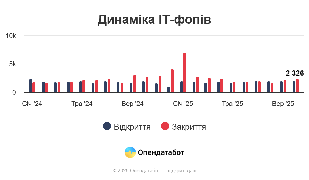Згідно з Опендатабот, цьогоріч в Україні було зареєстровано 18 605 нових IT-фопів, при цьому закрились — 26 158 (загалом за рік втрати галузі зросли майже втричі).