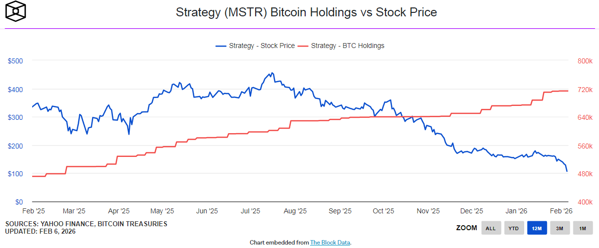 Компанія Strategy повідомила про операційний збиток у $17,4 млрд у четвертому кварталі, з яких значна частина припадає на нереалізовані втрати за біткоїн-резервами. Чистий збиток склав $12,6 млрд проти $671 млн роком раніше. Акції MSTR завершили сесію на $107, після чого впали до $100 на післяторговій сесії, втративши понад 70% від торішніх показників. На балансі компанії на початок лютого знаходяться 713 502 BTC, куплені в середньому по $76 тис. за монету.