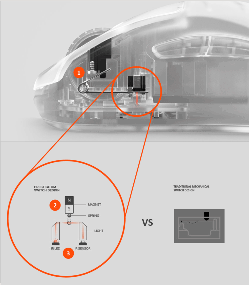 - Подібна ідея начебто виглядає дуже цікавою, але реальна спроба SteelSeries запропонувати радикально інший підхід до перемикача миші під назвою Prestige OM з використанням оптичної та магнітної технологій одночасно не стала вдалою: